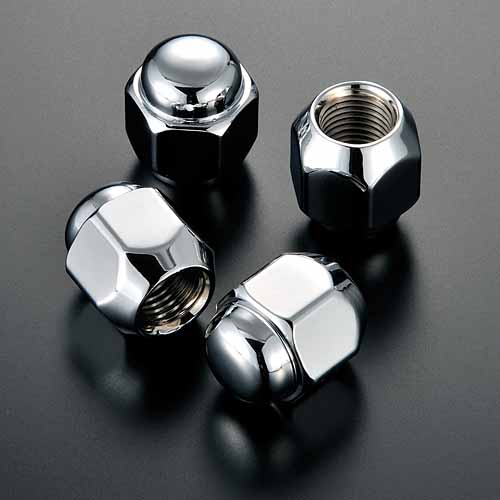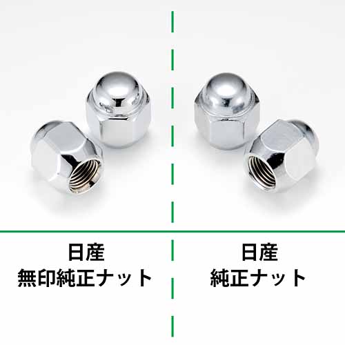 右がメーカー純正品。左が当社製「無印ナット」です。形状、光沢の違いをご覧ください。